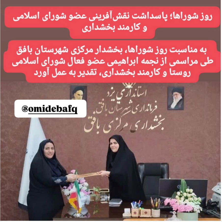 به مناسبت روز شوراها، مراسمی با حضور بخشدار مرکزی شهرستان بافق برگزار شد که در آن از نجمه ابراهیمی، عضو فعال شورای اسلامی روستای خوسف و کارمند بخشداری مرکزی، تقدیر به عمل آمد.